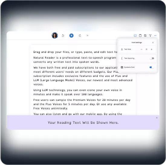 Closed Captions help readers with visual impairments and Dyslexia Friendly Font helps you read while you listen.